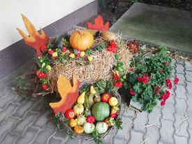 Alapítványunk támogatásával az intézmény díszítéséhez a Tökvásáron vásárolt dísztökök elhelyezésre kerültek a bejárati ajtó előtt felállított őszi életképben.